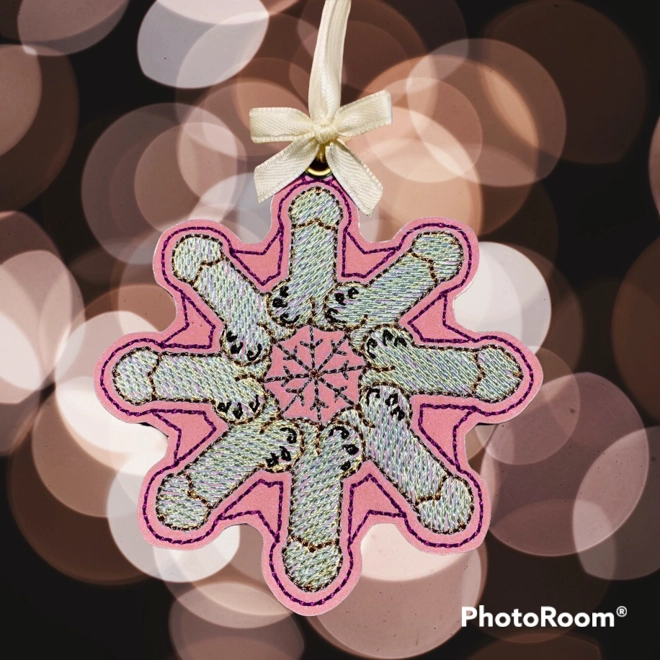 Machine embroidered ornament measures approximately 4 in x 4 in.